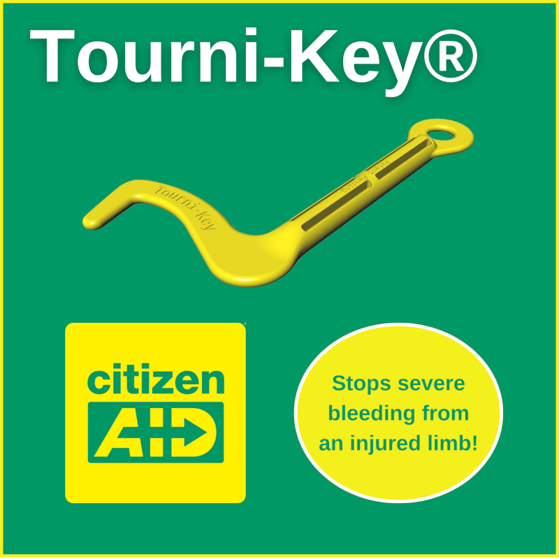 Designed and manufactured by citizenAID®, the Tourni-Key combines a novel tough plastic lightweight device, a triangular bandage to act as an effective tourniquet to stop severe bleeding from an injured limb, and an anti-pinch card to stop skin bunching.